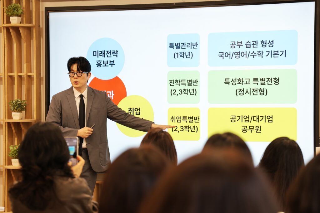 - 취업지원부 & 진학지원부: 학부모님들의 관심이 가장 뜨거웠던 시간이기도 합니다! 공기업/대기업/공무원을 향한 ‘취업특별반’과 정시전형을 대비하는 ‘진학특별반’ 운영에 대한 촘촘한 로드맵이 제시되었습니다. 숫자로 증명하는 본교의 압도적인 취업 경쟁력과, 대입을 위한 방과 후 주야간 자율학습 프로그램 안내를 통해 학부모님들께 든든한 믿음을 심어드렸습니다.