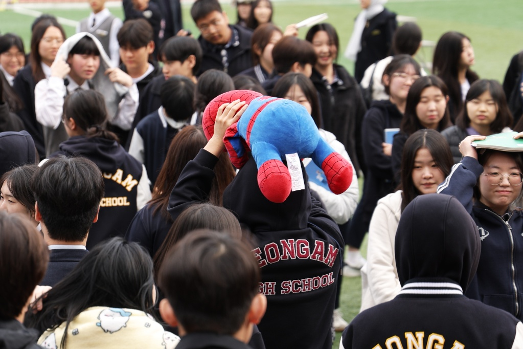 영상교육이 끝난 뒤 대피 훈련이 시작되었습니다! 학생들은 선생님들의 안내에 따라 신속하게 교실을 빠져나와 운동장으로 향했는데요. 낙하물로부터 머리를 보호하는 것은 지진 대피의 기본 중 기본! 두꺼운 책은 물론이고, 겉옷, 심지어 귀여운 스파이더맨 인형까지 동원해 야무지게 머리를 감싸고 질서 있게 계단을 내려오는 모습이 아주 인상적이었습니다. (스파이더맨이 머리를 든든하게 지켜주었네요! 🕷️)