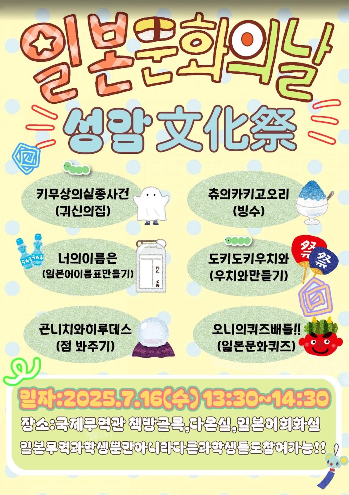 일본의 전통과 문화를 직접 체험한 뜻깊은 하루 지난 7월 16일, 본교에서는 2025학년도 일본 문화의 날 행사가 학생들의 뜨거운 참여 속에 성공적으로 마무리되었습니다. 다양한 부스와 체험 프로그램을 통해 일본의 전통, 예술, 축제 문화를 몸소 경험하며 서로 소통하고 협력하는 특별한 시간을 가졌습니다. 학생들이 직접 운영한 다채로운 부스 총 6개의 체험 부스는 학생들의…